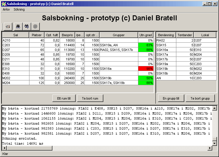 En sökning görs för att hitta en optimal lösning. Sökningar kan startas med menyn eller med en knapp i knappraden. Innan dess måste tillgängliga salar matas in (eller laddas in från en fil). För varje sal finns ett antal data: